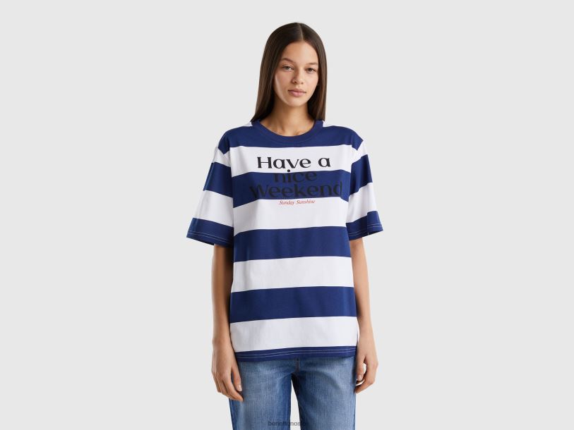 blå Benetton kvinner stripet t-skjorte med slagord 20TRB321