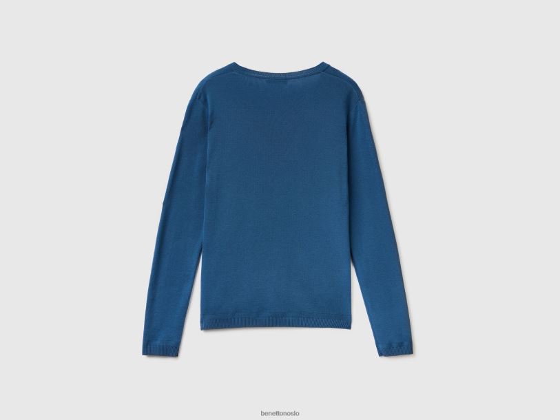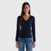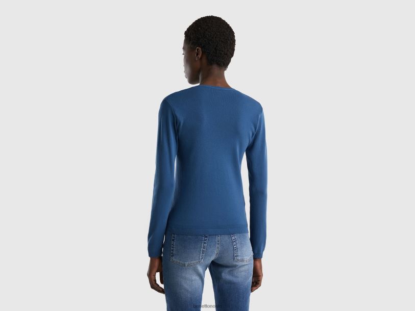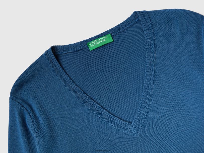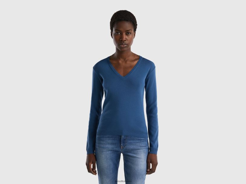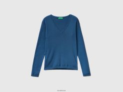 blå Benetton kvinner v-halset genser i ren bomull 20TRB3681