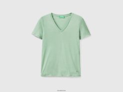 grønn Benetton kvinner t-skjorte i ren bomull med v-hals 20TRB417