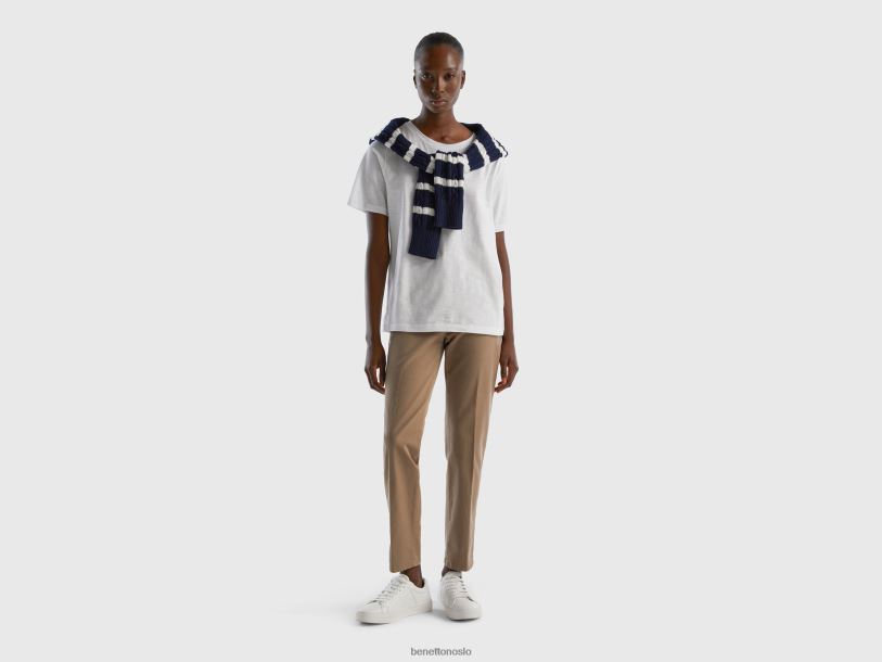 hvit Benetton kvinner T-skjorte med rund hals i slub bomull 20TRB3860