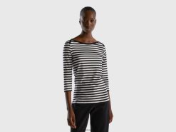 svart Benetton kvinner stripet 3/4-ermet t-skjorte i ren bomull 20TRB442
