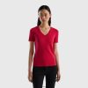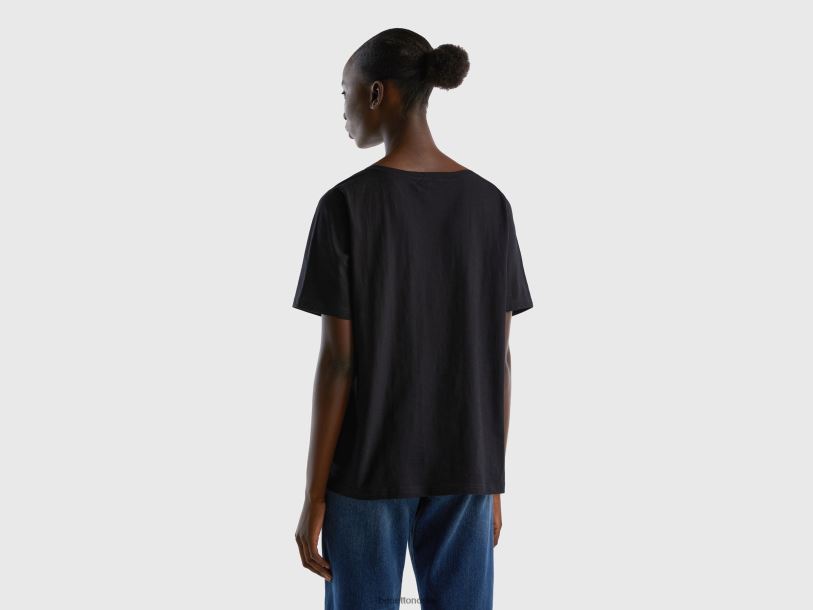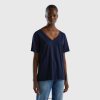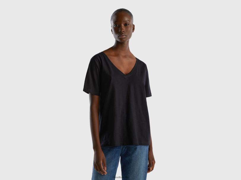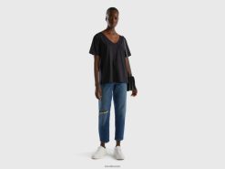 svart Benetton kvinner V-hals t-skjorte i slub bomull 20TRB3793