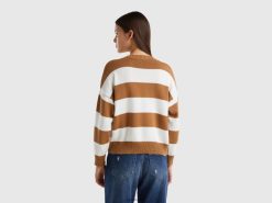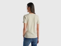 beige Benetton kvinner t-skjorte i ren bomull med v-hals 20TRB444