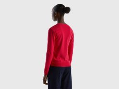 fuchsia Benetton kvinner V-hals t-skjorte i slub bomull 20TRB363