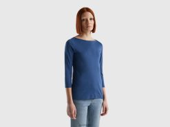 blå Benetton kvinner t-skjorte med båthals i 100 % bomull 20TRB3931