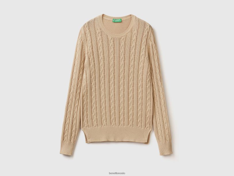 beige Benetton kvinner kabelstrikket genser 100% bomull 20TRB3618