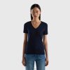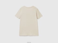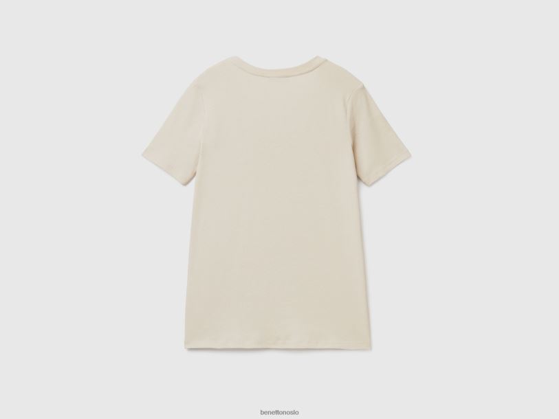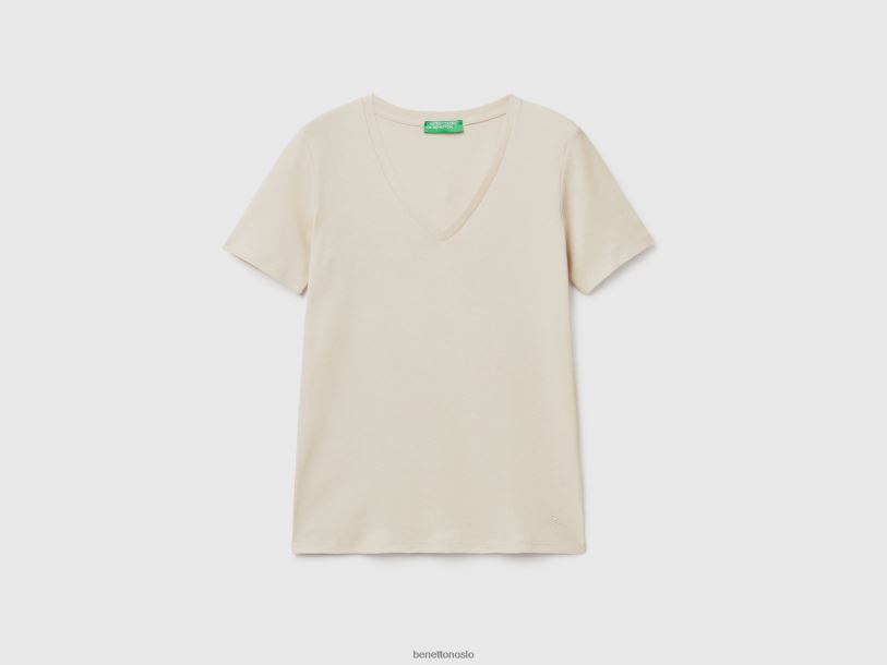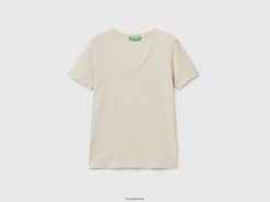 beige Benetton kvinner t-skjorte i ren bomull med v-hals 20TRB444