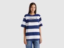 blå Benetton kvinner stripet t-skjorte med slagord 20TRB3797