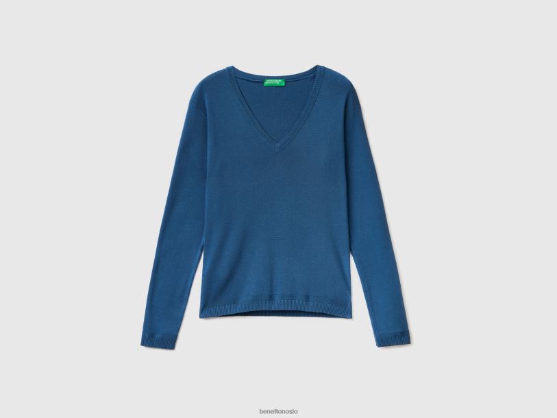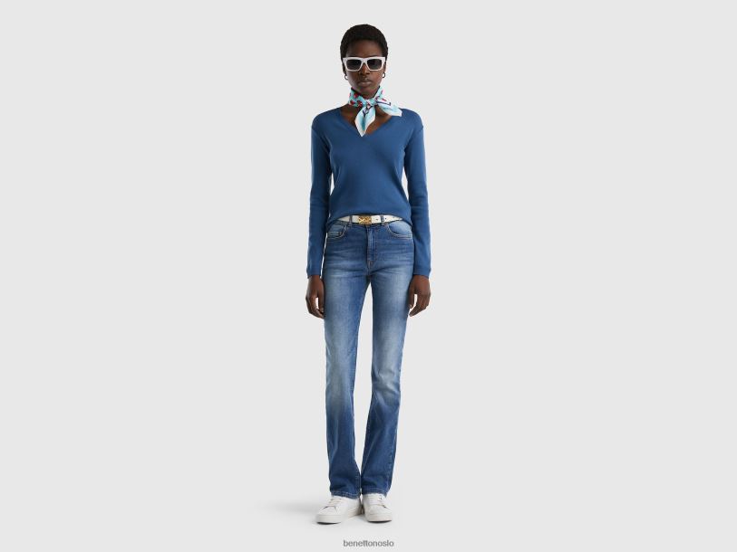 blå Benetton kvinner v-halset genser i ren bomull 20TRB235