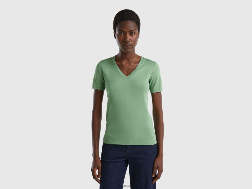 grønn Benetton kvinner t-skjorte i ren bomull med v-hals 20TRB417