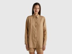 kamel Benetton kvinner lang skjorte i rent lin 20TRB514