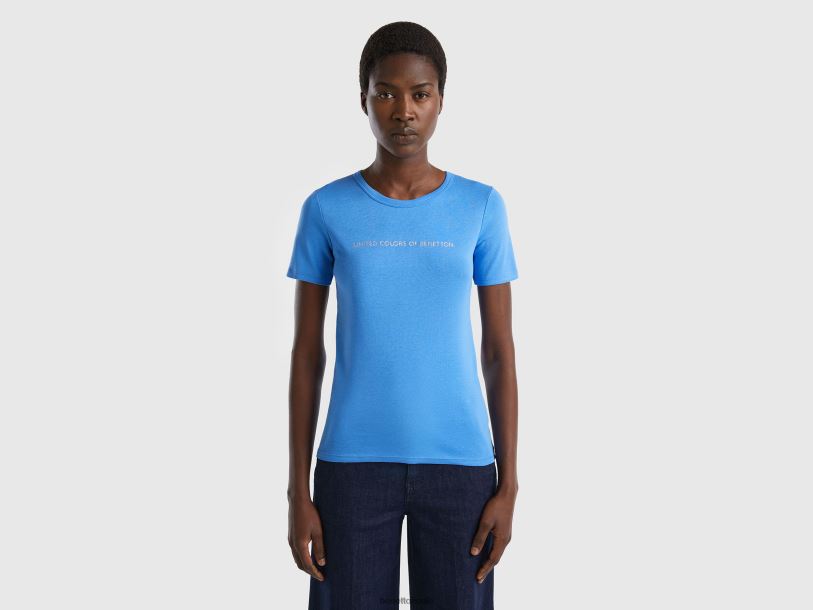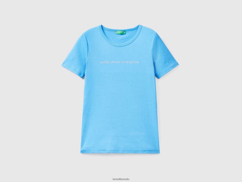 lyse blå Benetton kvinner t-skjorte i 100 % bomull med glittertrykk logo 20TRB370