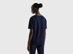 mørke blå Benetton kvinner T-skjorte med rund hals i slub bomull 20TRB374
