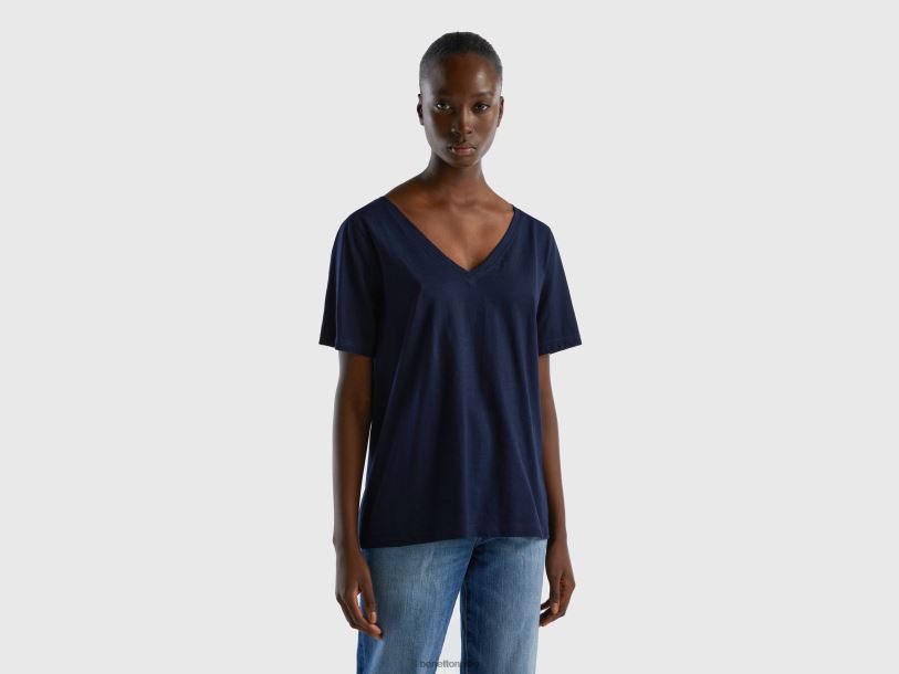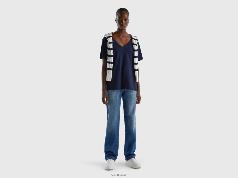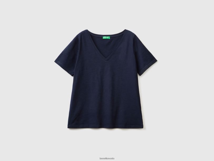 mørke blå Benetton kvinner V-hals t-skjorte i slub bomull 20TRB3792
