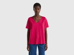 fuchsia Benetton kvinner V-hals t-skjorte i slub bomull 20TRB363