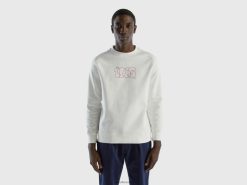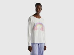 kremhvit Benetton kvinner t-skjorte med trykk i langfiber bomull 20TRB1033