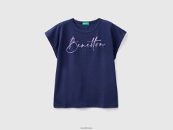 mørke blå Benetton barn t-skjorte med glitrende logo i økologisk bomull 20TRB5304