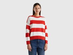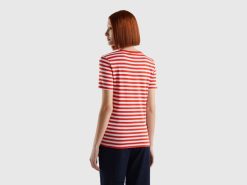 rød Benetton kvinner stripete t-skjorte med rund hals 20TRB345